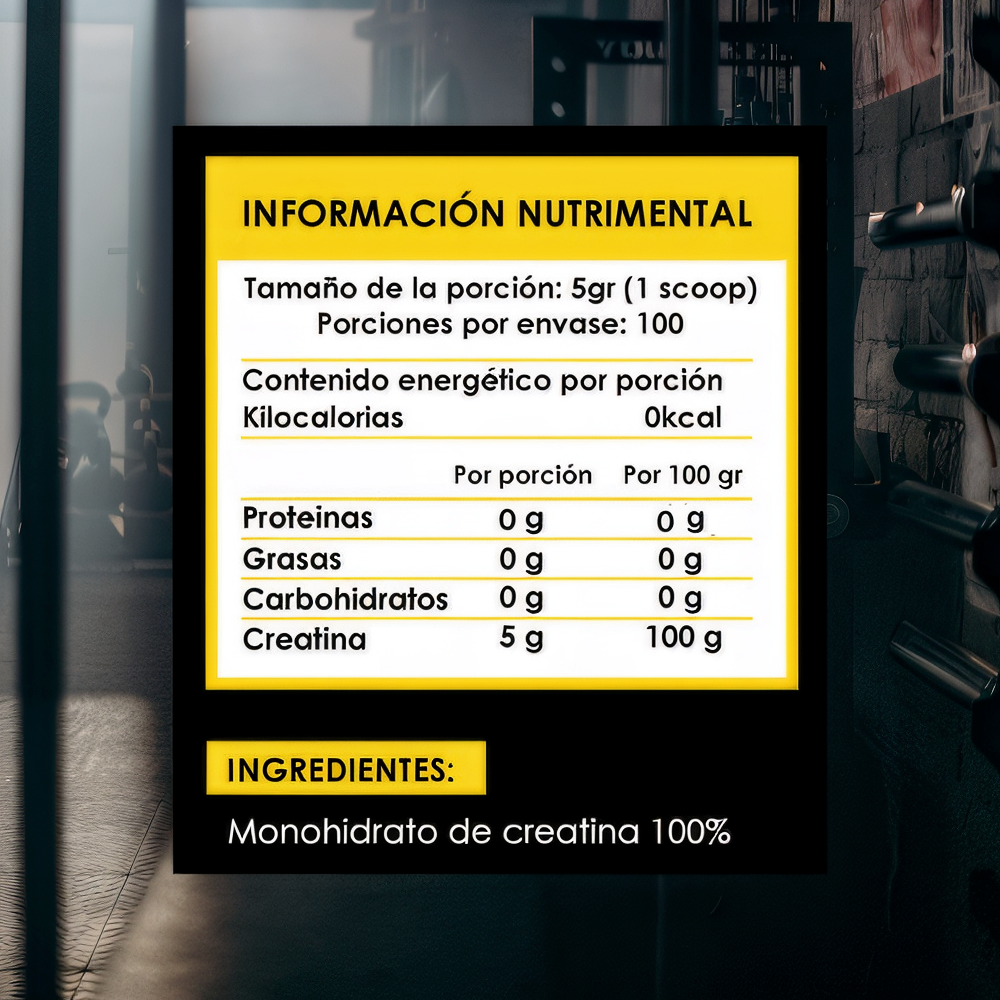 Cuando buscas maximizar tu fuerza, potencia y recuperación, necesitas lo esencial: creatina 100% pura y monohidratada. Sin saborizantes, sin ingredientes innecesarios, solo resultados.